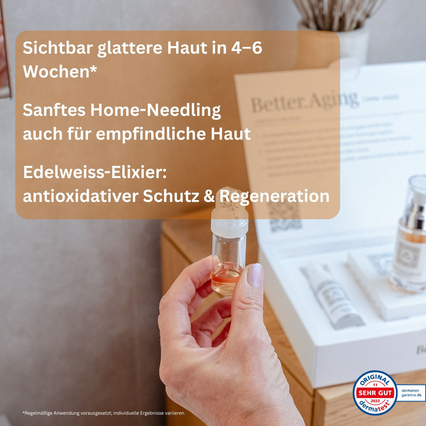 Gezielte Microreize stimulieren die Hauterneuerung; das Edelweiss-Elixier unterstützt Barriere & Schutz vor oxidativem Stress. Im Komplettset für zu Hause – präzise, effizient, in <10 Minuten pro Anwendung.